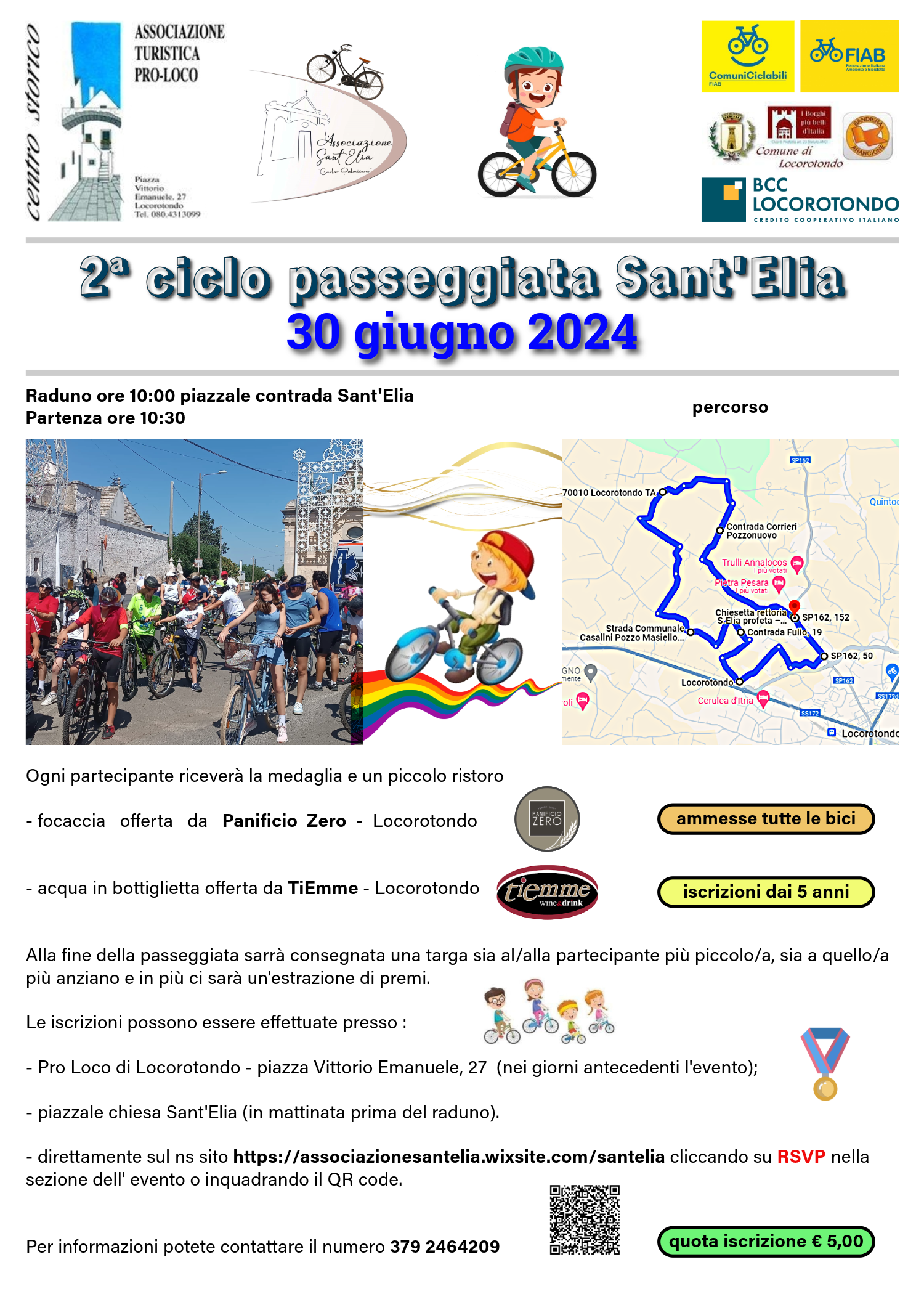 L'associazione Sant'Elia "Carlo Palmisano" e la Pro Loco di Locorotondo hanno organizzato per domenica 30 giugno la 2ª Ciclo passeggiata Sant'Elia 2024